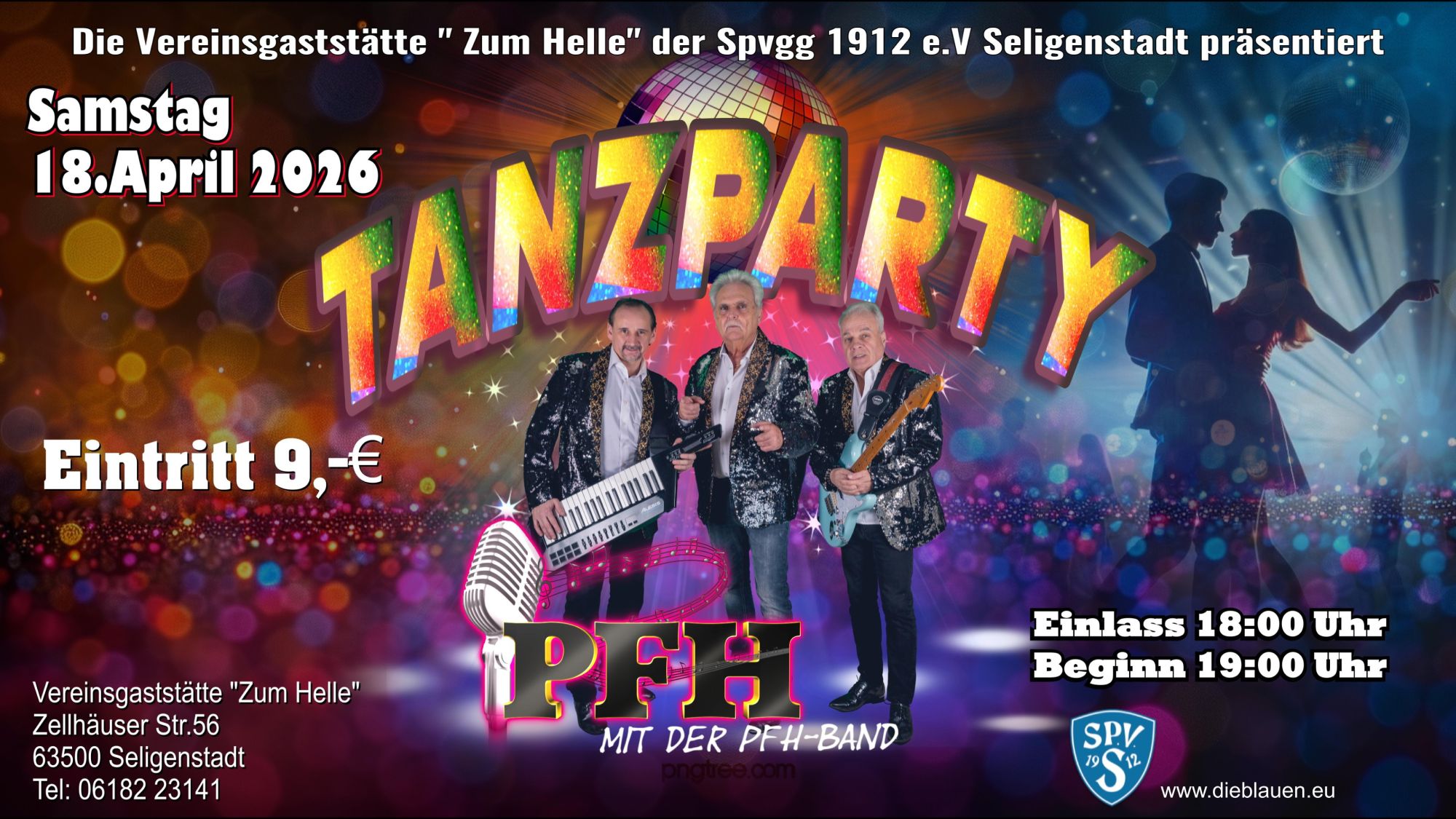 Am Samstag, 18. April 2026 findet im Clubhaussaal ab 19 Uhr die nächste Tanzparty statt. Der Einlass ist um 18 Uhr. Zum Tanz spielt die Band PFH. Der Eintritt kostet 9 EUR.